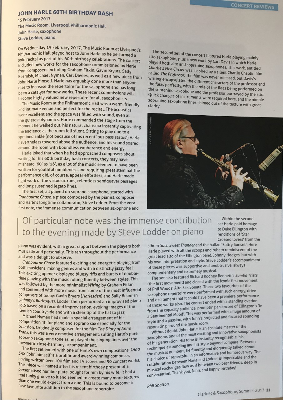Clarinet and Saxophone Society of Great Britain, Autumn 2017 An article written by Phil Shotton featured in the Autumn edition of CASS about John Harle's 60th Birthday Bash. Read the full article.